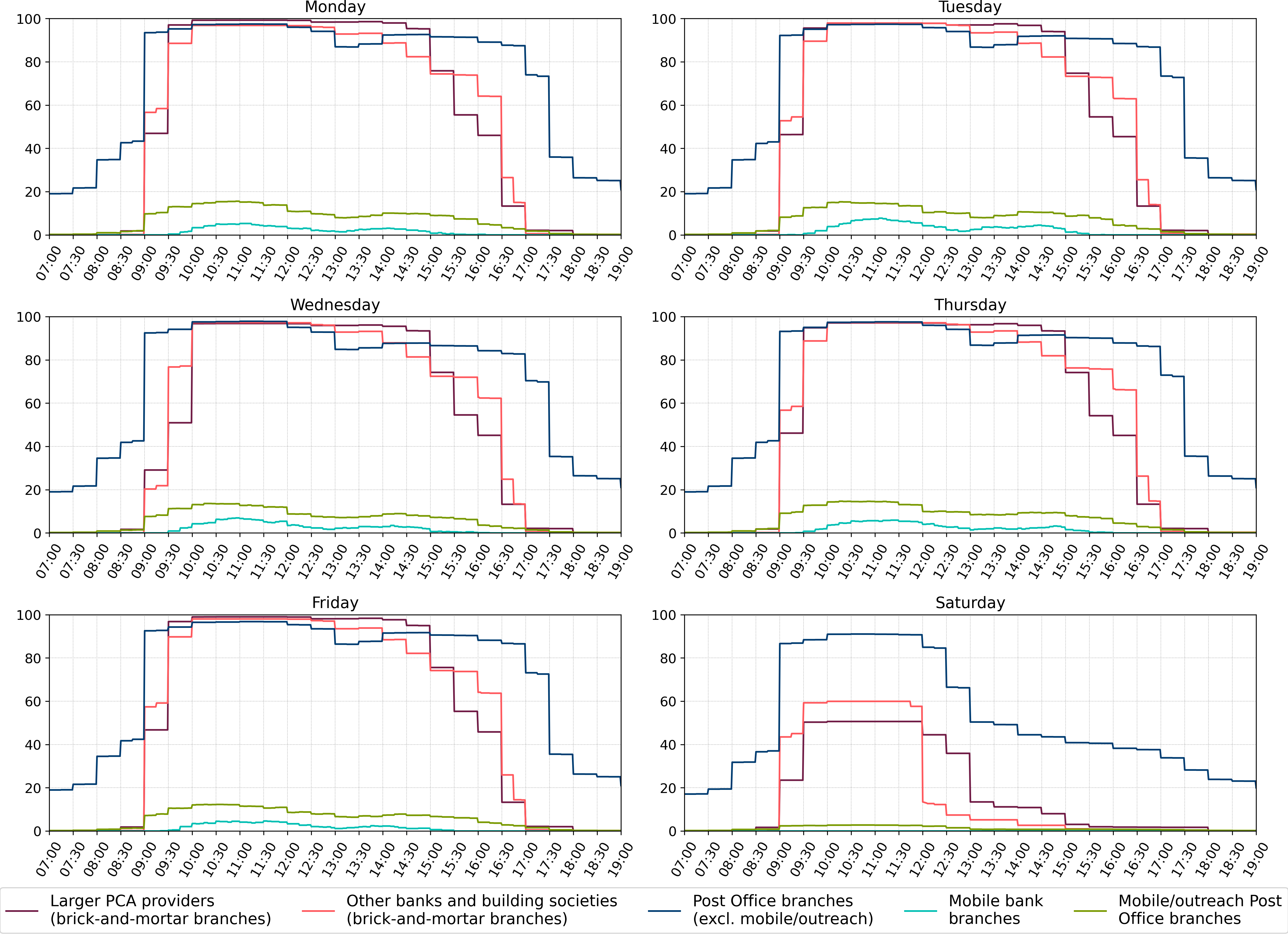 Figure 2 shows the percentages of branches open at a given time between 7am and 7pm, Monday to Saturday (see note 10), by branch types defined in Table 1.