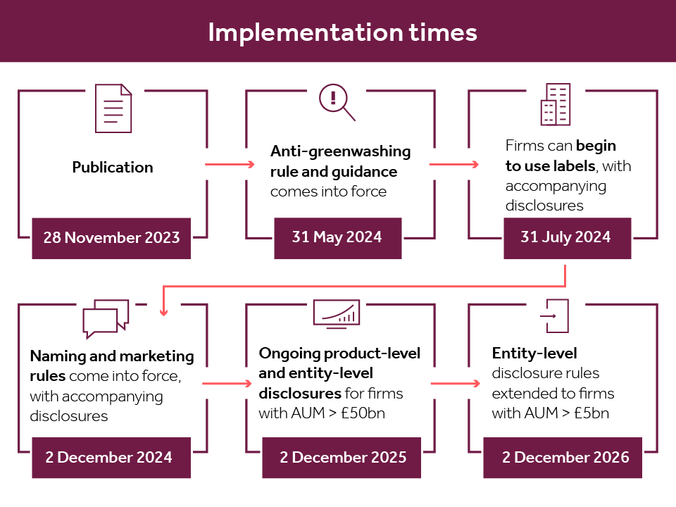 From 31 May 2024, firms need to ensure their sustainability references are fair, clear and not misleading, and proportionate to the sustainability profile of the product and service. However, firms subject to the naming and marketing rules for asset managers aren't required to meet those additional requirements until 2 December 2024.